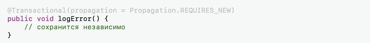Поэтому REQUIRES_NEW — это точечный инструмент. Он отлично подходит для изолированных действий (логирование, аудит, отправка служебных записей), но использовать его «на всякий случай» — почти всегда плохое решение.