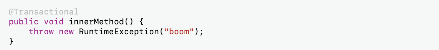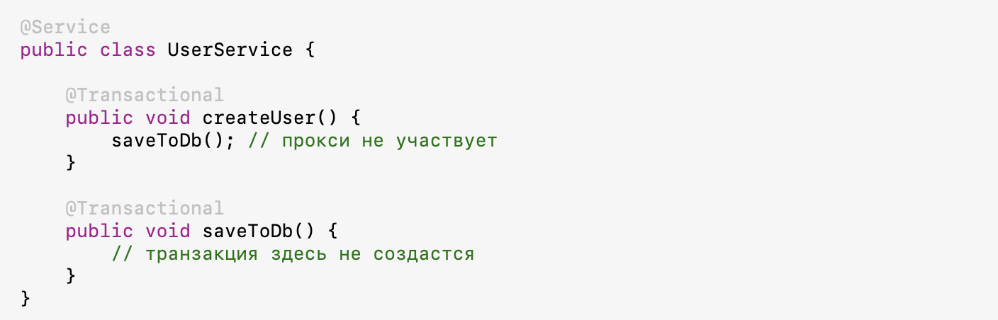 Например, если метод вызывает другой метод внутри того же класса, прокси в этом не участвует. Вызов происходит напрямую, и никакой транзакции для второго метода не будет, даже если он тоже помечен @Transactional.