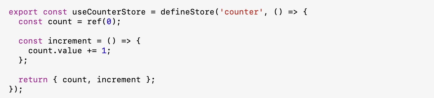Самое приятное — простота. Вы определяете стор, используете его в компонентах и всё просто работает.