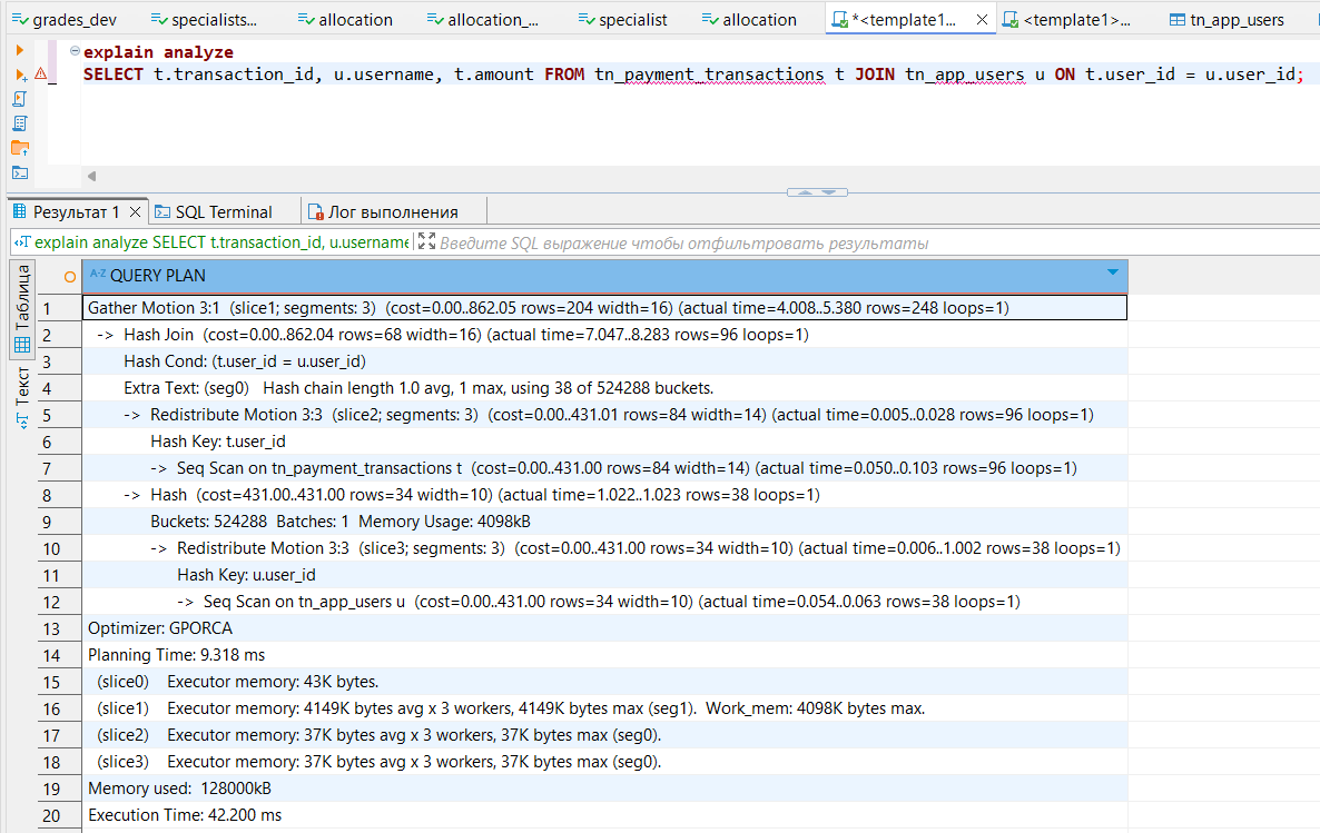 В Greenplum (как и в PostgreSQL) оптимизатор сам решает, как выполнять запрос. Но в MPP-базе цена ошибки в плане выше: данные могут начать массово «переезжать» между сегментами, и тогда запрос, который должен выполняться за секунды, будет крутиться минутами.
